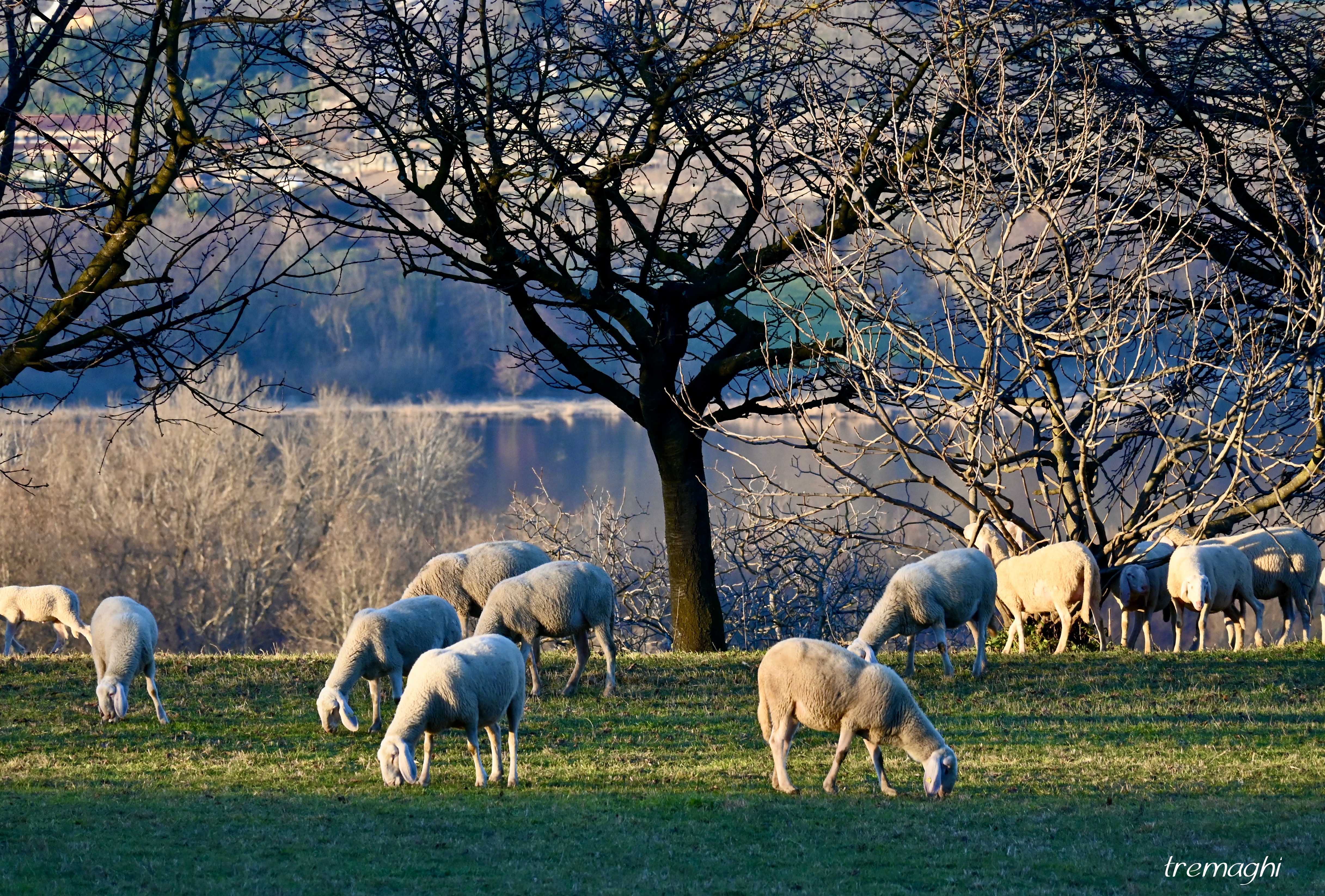 Faccio quattro passi lungo una strada privata che scende verso il lago e all’interno di una proprietà privata scorgo un gregge di pecore. Seguo la recinzione finché raggiungo un cancello tra le cui inferiate riesco a far passare lo zoom della Nikon. Non ho molto “spazio di manovra”, ma mi accontento e scatto un pò di foto ai dolci ovini che pascolano.