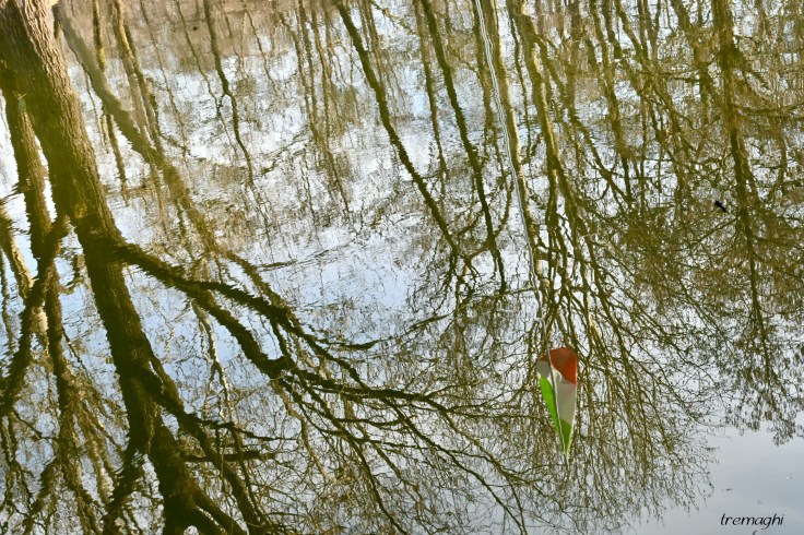 C’è anche una piccola bandiera italiana che sventola, mossa dalla leggera brezza di vento e il suo riflesso nello specchio nell’acqua, tra le chiome degli alberi, sembra un quadro astratto.