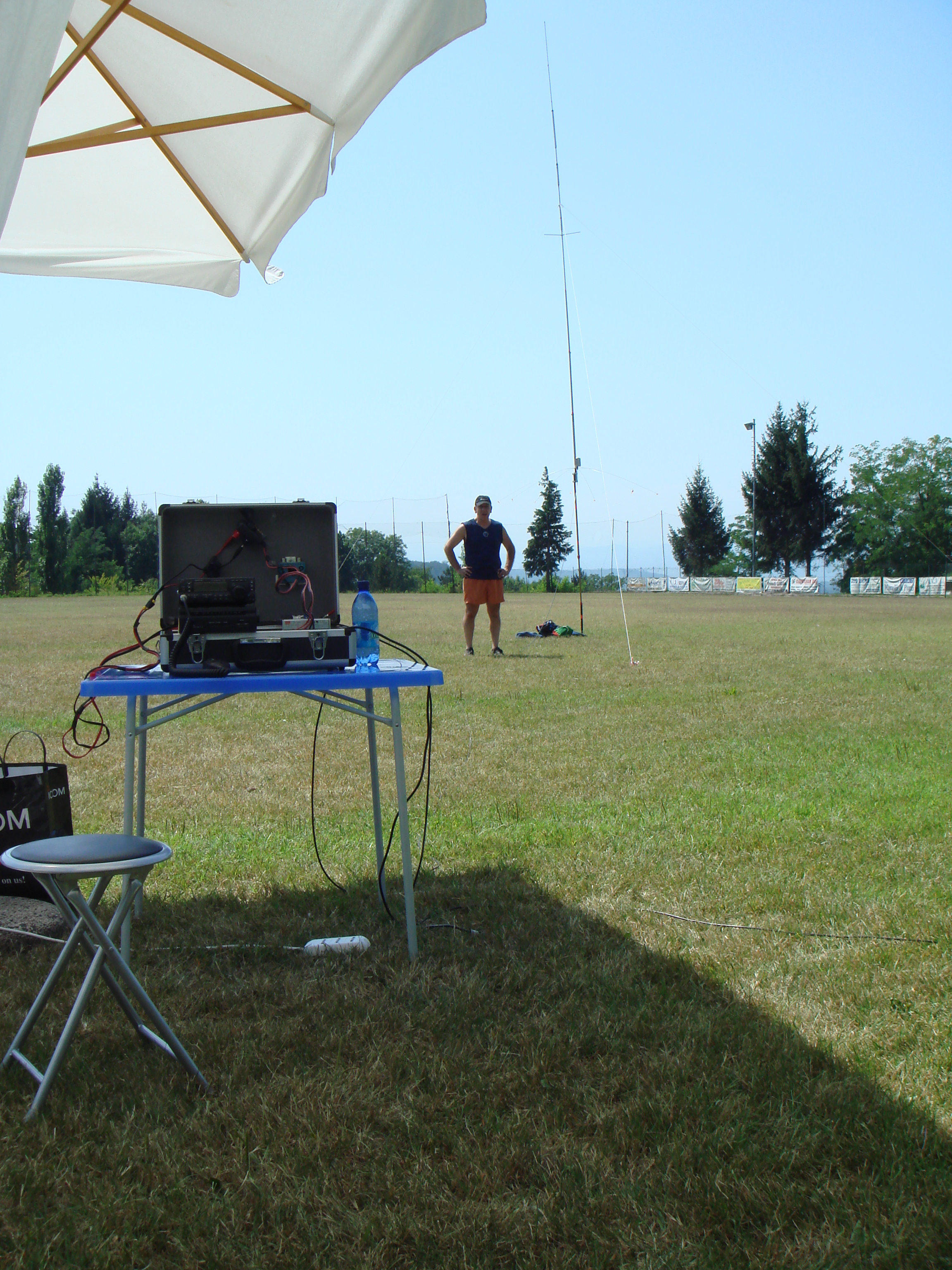 Alle 14:00 iniziavamo ad allestire la nostra postazione portatile; mentre Emanuela era alle prese a sistemare tavolino, sedie e la valigetta con radio, accordatore e switching, sotto un sole cocente ho installato al centro del campo sportivo la nuova (strutturalmente!) verticale 7 bande dell’amico Giovanni I1UJX (sk), che nonostante non necessiti di controventatura, ho preferito assicurare al terreno con tre corde di nylon per una maggior sicurezza in presenza di ragazzi.
