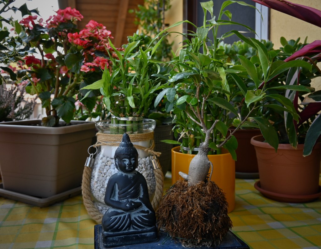 Anche il mio piccolo Ficus Microcarpa Ginseng continua a germogliare da quando è in vacanza, protetto da due piante di bambù e dalle folte chiome di due alberelli di giada. É un bonsai kodekama, che ripresenta come una palla di muschio adagiata su un vassoietto di terracotta blu, al fianco della statuetta di Buddha. E’ un’antica tecnica giapponese che risale al 1600, il cui significato letterale è per l’appunto palla di muschio e che prevede l’assenza del vaso, ma un’attenta composizione del terriccio che deve essere acido e fangoso, amalgamato con un componente argilloso dalle proprietà drenanti, chiamato akadama (palla rossa), composto che verrà rivestito di muschio. Chiamato anche bonsai volant, per la sua cura mi assicuro che nel vassoietto ci sia sempre acqua che la mia pianta beve quando ha sete, inoltre se piove, la lascio per qualche ora sotto la pioggia (se non è battente) per lavarle le foglie in modo naturale.
