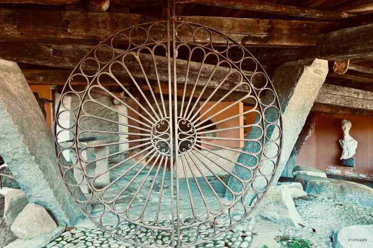 Il bellissimo cancello in ferro battuto dalla forma tonda e sorretto da due grosse pietre mi apre le porte del Giardino dell’Anima, un porticato magico, mozzafiato. La scultura della Madre del Cristo mi fa emozionare e penso non é un caso che sia rivolta verso quella che interpreto come una grande meridiana in pietra con il sole al suo fianco.