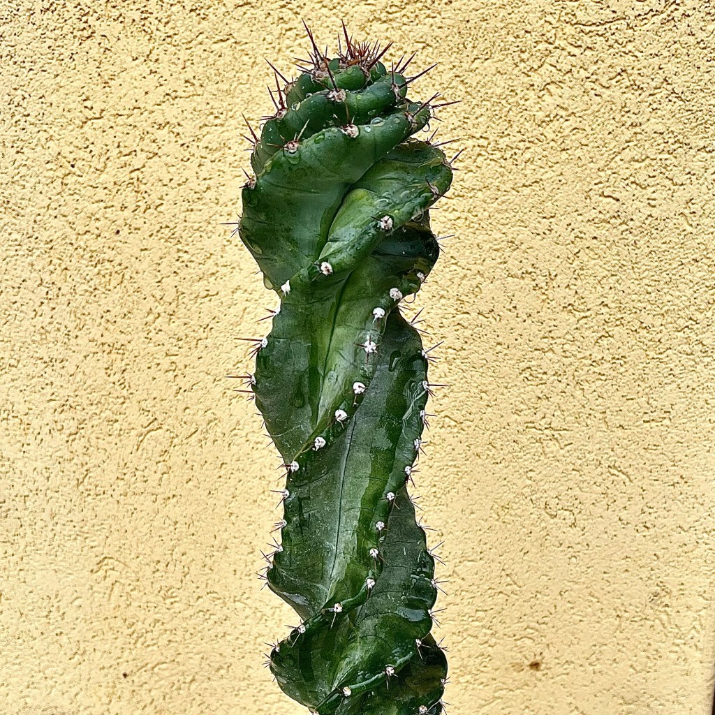 Hanno cosparso anche la superficie del mio Cereus forbesii “spiralis”, che ho riportato all’esterno affinché si bagnasse con l’acqua piovana. Questa pianta, originaria del sud America e il cui nome deriva dal latino e significa “candela” per la forma del suo stelo, quest’anno ha avuto una crescita eccezionale soprattutto alla sommità, allargando la spirale e assumendo la forma di una rosa. Ora non mi resta che sperare che il prossimo anno mi regali anche una fioritura.