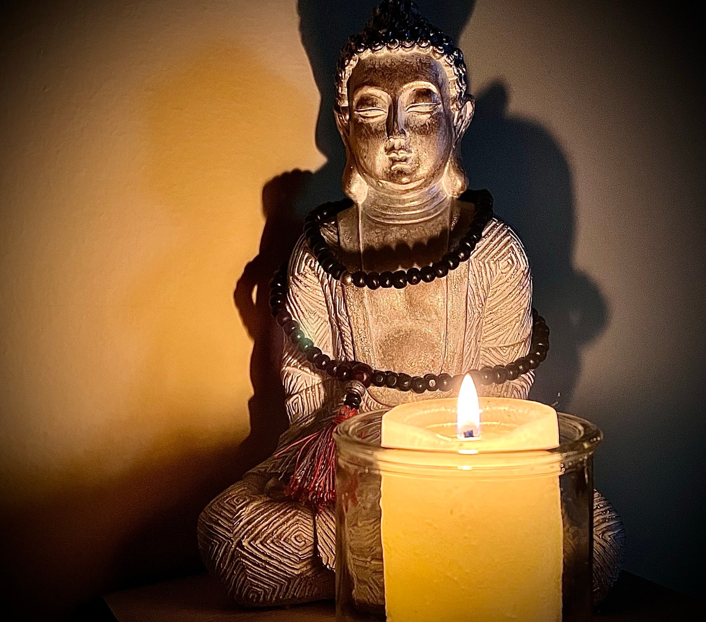 Mi sono creata il mio angolino, Illuminando fievolmente l’ambiente con una candela posta davanti a una statuetta di Buddha e tenendo in mano il mala di 108 grani in legno di palissandro confezionato dal monaco Issan del monastero zen Sanboji – Tempio dei Tre Gioielli di Berceto, medito ogni mattina per almeno una ventina di minuti, un lasso di tempo che potrebbe sembrare interminabile ma poi con la pratica se ne sente del tutto il bisogno.