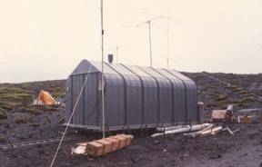 La nostra postazione di antenne era a posta all’esterno, con diverse direttive, verticali e antenne filari. A causa della difficoltà di infilare picchetti nel terreno vulcanico e roccioso, sono stati utilizzati i grandi ceppi di Azorella come punti di ancoraggio. Purtroppo, alla fine abbiamo dovuto abbandonare il progetto preferito di Bob, la Minooka Special, un’antenna verticale per 160 metri. Gli scienziati e alpinisti si erano presentati per aiutarci a erigere il mostro, posizionando almeno una persona per ogni tirante. Bob fungeva da maestro di cerimonia, gridando “tira” a questo o quell’altro mentre altri sollevavano le sezioni assemblate per consentire a Bob di erigere a poco a poco l’antenna. Anche la Minooka Special era stata completata, la parte superiore appena distinguibile, che ondeggiava nella nebbia bassa, quando una mossa falsa rese l’intera antenna un cumulo di tubi accartocciati.