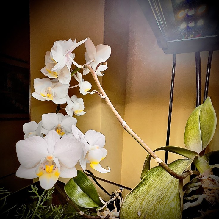 Delle orchidee mi prendo cura personalmente, parlando loro e trattandole con molta dolcezza. Ogni giorno nebulizzo le radici utilizzando l’acqua osmotica arricchita con sali e fertilizzanti che settimanalmente sostituiamo per il ricambio (che uso anche per bagnare le altre piante di casa), spostando delicatamente le foglie finché tutta la radice possa bagnarsi un pochino, senza esagerare.