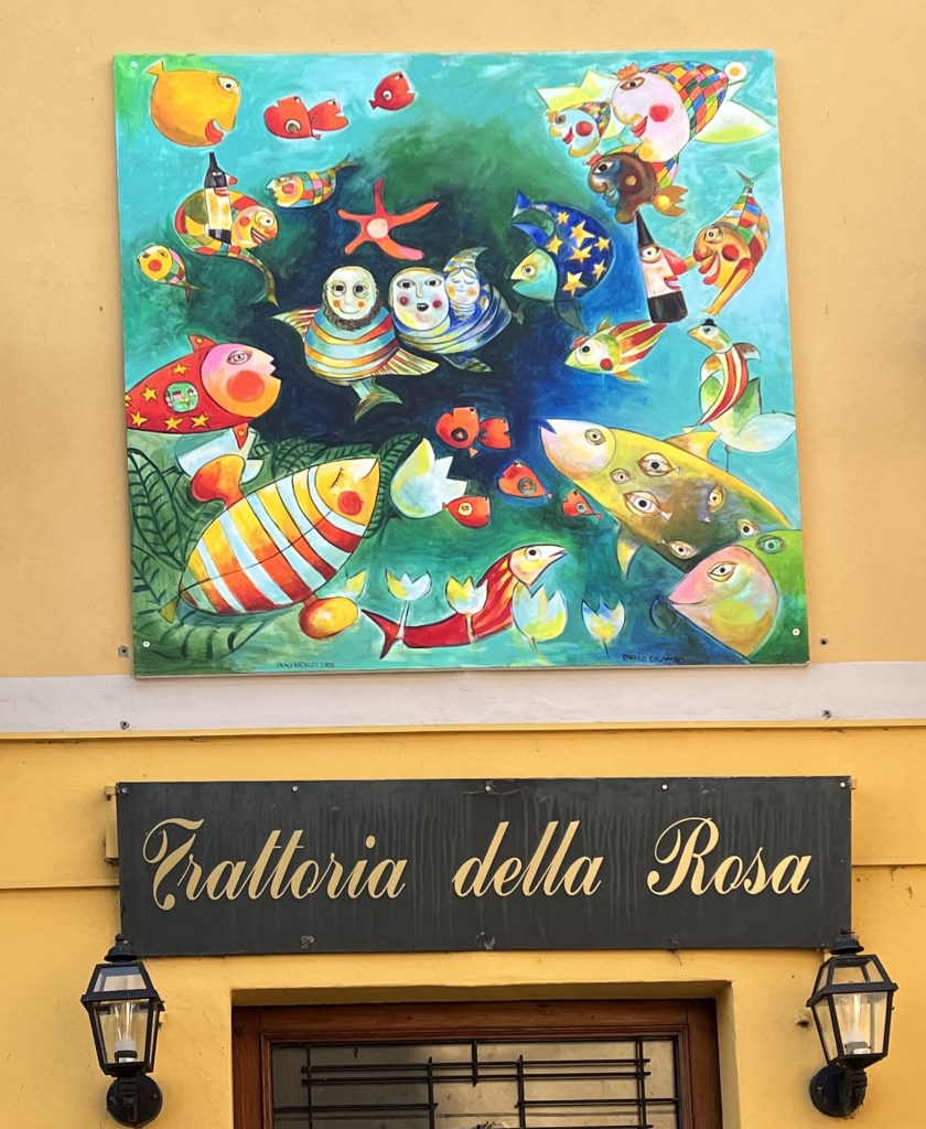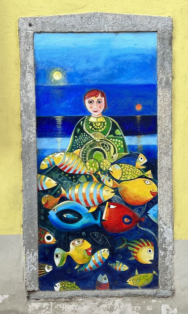 Prima tappa mordi e fuggi il lido di Bodio Lomnago, quindi decido di portarla a Cazzago Brabbia, che non conosce e a un tiro di schioppo. Parcheggiata l’auto, percorriamo le strette vie tra antichi edifici e romantici cortili, affascinate dai dipinti con protagonisti i coloratissimi pesci di Chicco Colombo, splendide opere del celebre burattinaio cazzaghese. Soggetti che non potevano essere altrimenti nel paese delle giazzér, le antiche ghiacciaie del ‘700 nel in quello che è il paese dei pescatori del lago di Varese per antonomasia, nonché sede dal 1922 della Cooperativa del Lago di Varese.