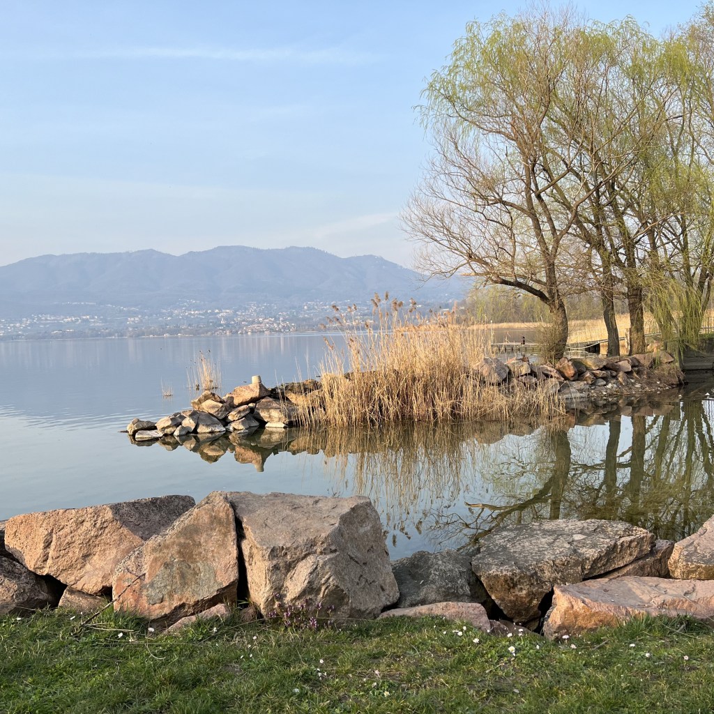 Passo dopo passo raggiungiamo il lago con la sua piccola darsena, con il salice piangente che sta mettendo i germogli e scorci che infondono tanto serenità.
