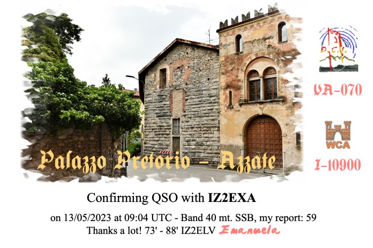 Sabato13 Maggio 2023 sarò on air nell’arco temporale compreso tra le 06:00 UTC alle 17:00 UTC dal mio QTH, partecipando al Weekend Castelli d’Italia nella categoria DCI-fisso e nel solo modo SSB, attivando la referenza DCI-VA070, Palazzo Pretorio di Azzate.