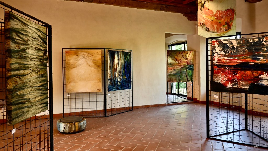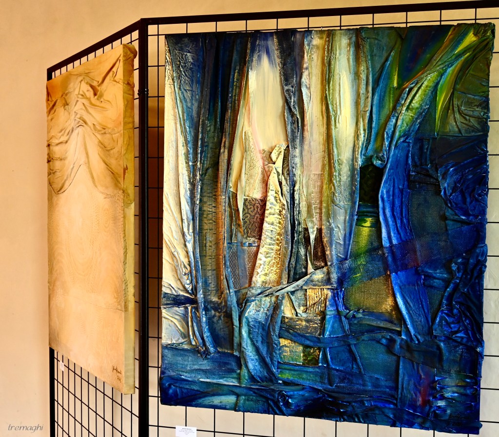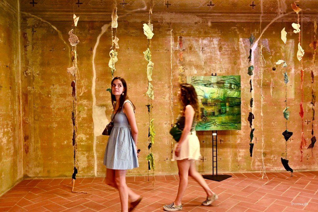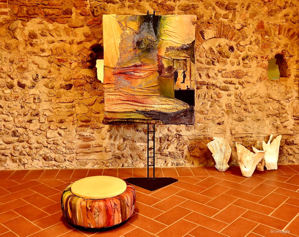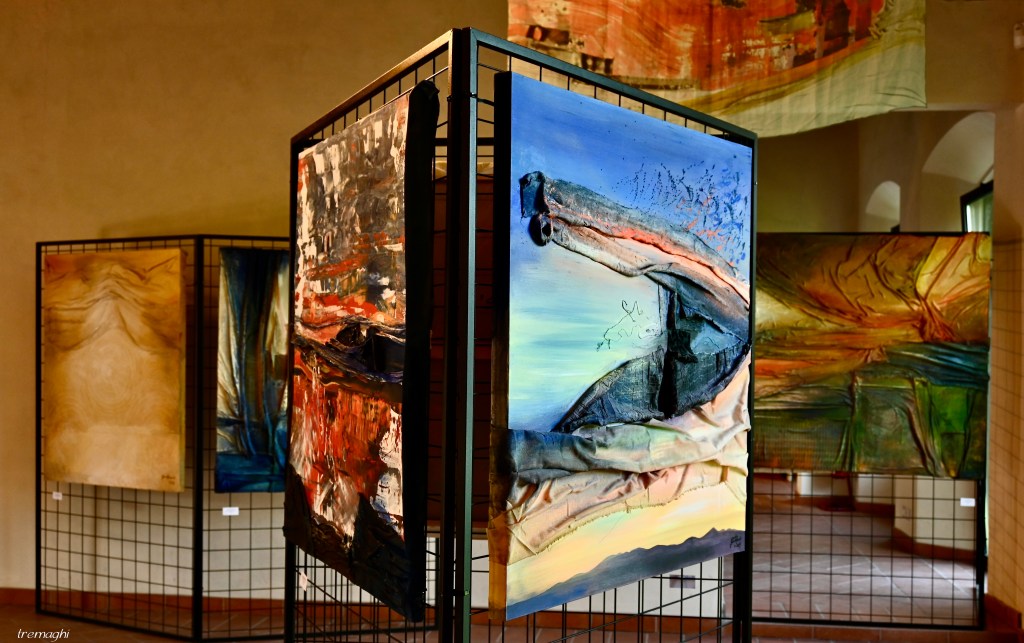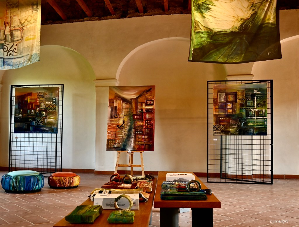 I colori caldi e le architetture dell’ampio spazio espositivo del complesso benedettino del VIII secolo hanno fatto da degna cornice a queste opere realizzate con tipi di tessuti di vario genere, dai campionari a semplici scarti che dopo essere stati plasmati e sapientemente colorati da Elena, rinascono a nuova vita in un contesto del tutto diverso per il quale erano stati creati in origine, per poi tornare, come per magia, ad essere nuovamente un tessuto, questa volta rinascendo come foulard o pareo che riproducono le opere dell’Artista.