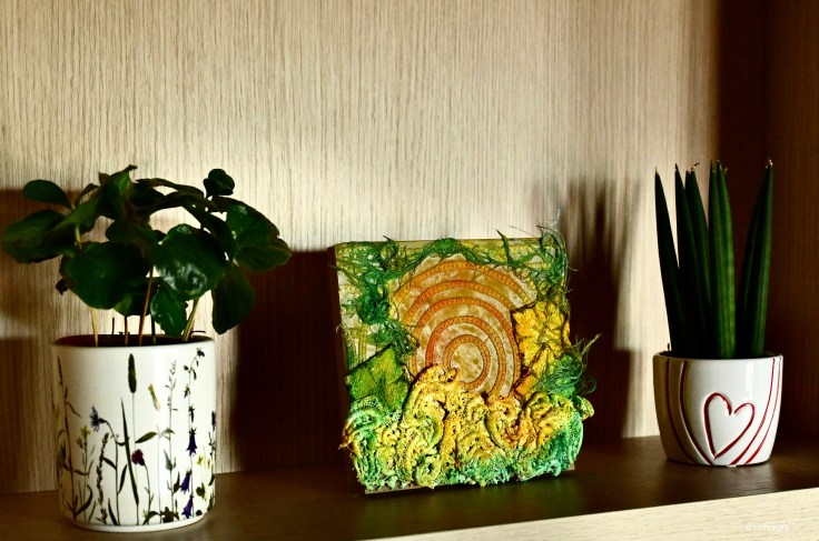 Avevo già visto all’opera Elena la scorsa domenica, durante la mia partecipazione a un laboratorio, quando aveva dato qualche tocco finale ai nostri lavori. Un’esperienza davvero coinvolgente, la mia prima volta alle prese con tessuti, pennelli, colla e colori. Mi sono fatta guidare dall’istinto, sia nella scelta del tessuto, pizzo e frangia, nell’assemblarli e colorarli. Non avrei mai pensato di farmi prendere da questa arte, al punto di pensare che quel piccolo lavoretto che ho fatto e chiamato “alba nella foresta di bambù” probabilmente non rimarrà l’unico. Ho già messo da parte alcuni nastri, piccoli scampoli di stoffa e pizzi per dare spazio alla mia creatività nei mesi invernali. Mi entusiasma l’idea di donare una nuova vita a dei tessuti che contrariamente sarebbero destinati a diventare stracci.