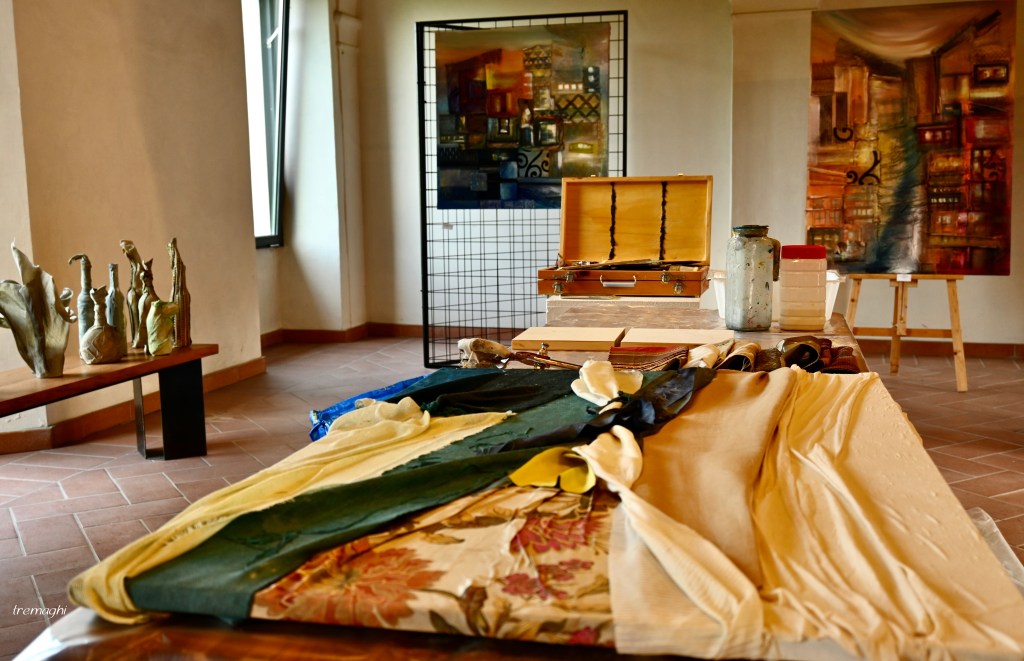 L’atmosfera é quella giusta, quasi mistica, sia per la sacralità del luogo e la bellezza delle opere esposte e che fanno da degna cornice al tavolo di lavoro di Elena, dove é pronta una tela con vari tessuti con trame diverse che disegnano forme astratte e pronti per essere colorati.