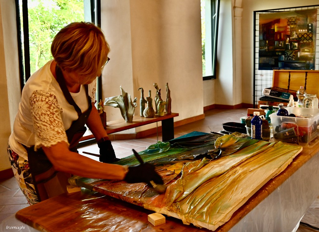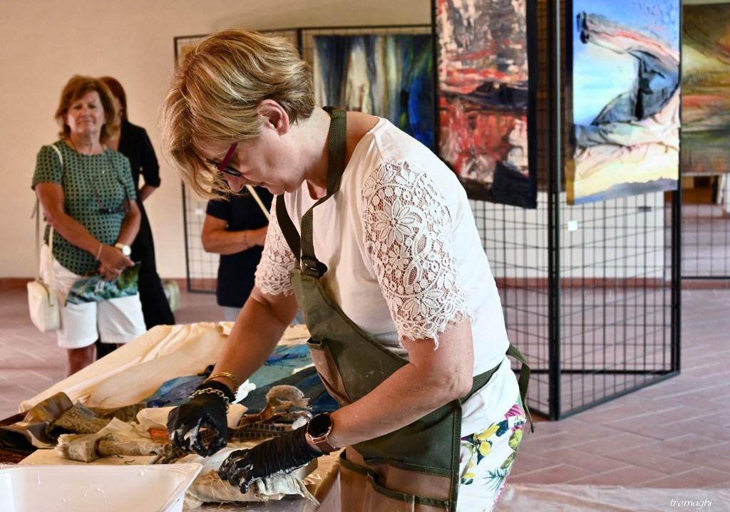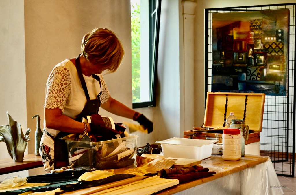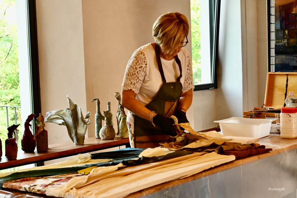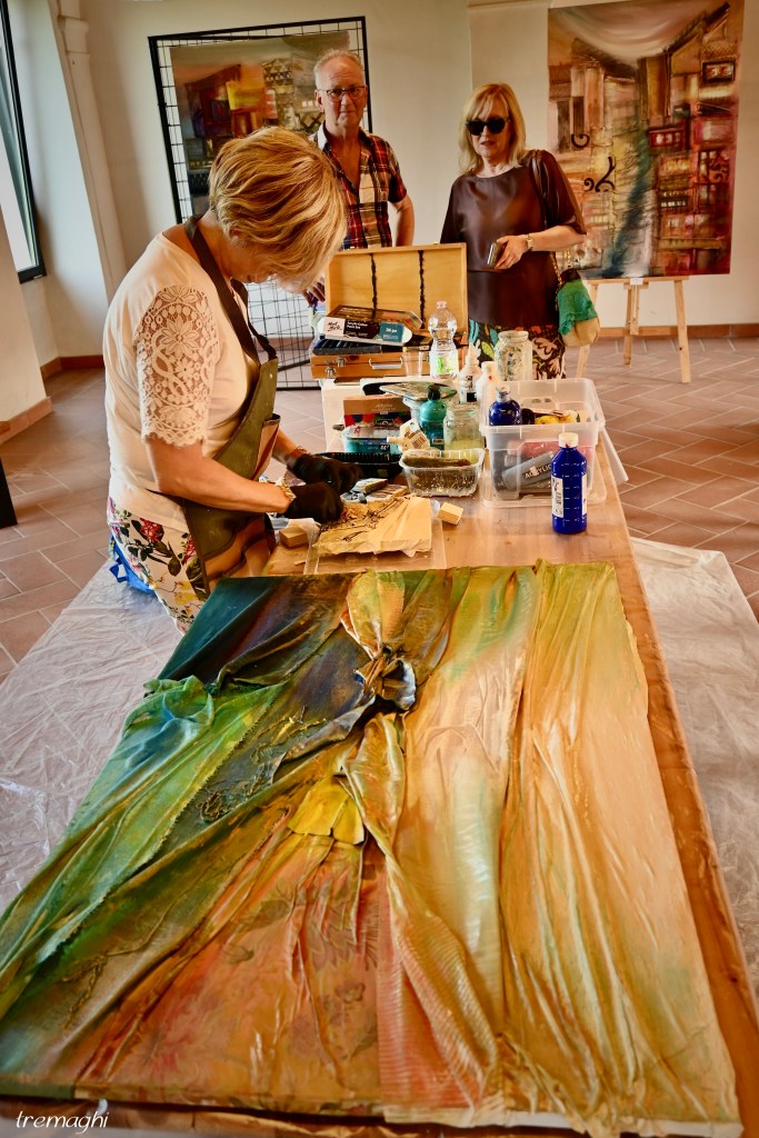 Il primo lavoro è creare da zero un’opera, scegliendo le stoffe, ritagliandole ed incollandole su una piccola tavoletta di legno, un lavoro minuzioso e fatto con l’abilità e la maestria che solo una grande Artista può dimostrare. Il gesto che più mi colpisce, è il recupero anche alcuni fili di scarto dal taglio del tessuto per completare l’opera, che è stata posta al sole sulla balaustra del chiostro per asciugare, prima di procedere alla colorazione.