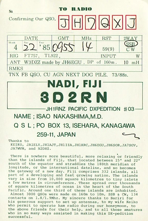 L’OM è in QSO con Isao JH1RNZ. Isao trasmette dalle Fiji con il call 3D2RN., dove sta trascorrendo la luna di miele… una nuova XYL viene accolta all’ovile.