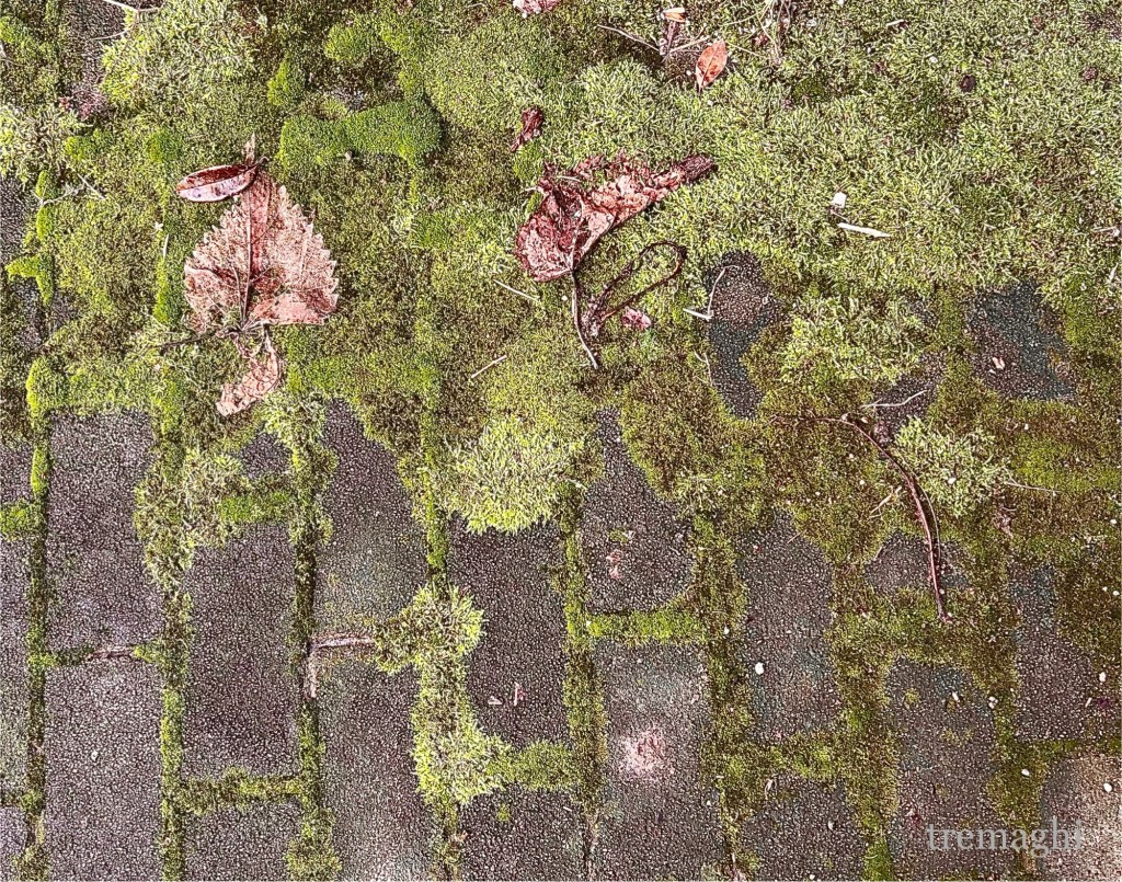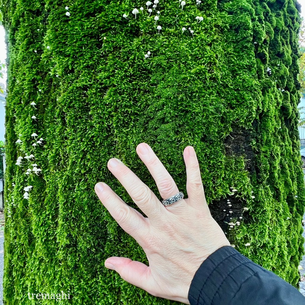 Le ricorrenti piogge che si susseguono dalla scorsa primavera hanno fatto crescere un folto muschio verde intenso sui tronchi. Mi fermo ad accarezzarne uno, é morbido come un velluto a la mia mano non riesce a fermarsi.