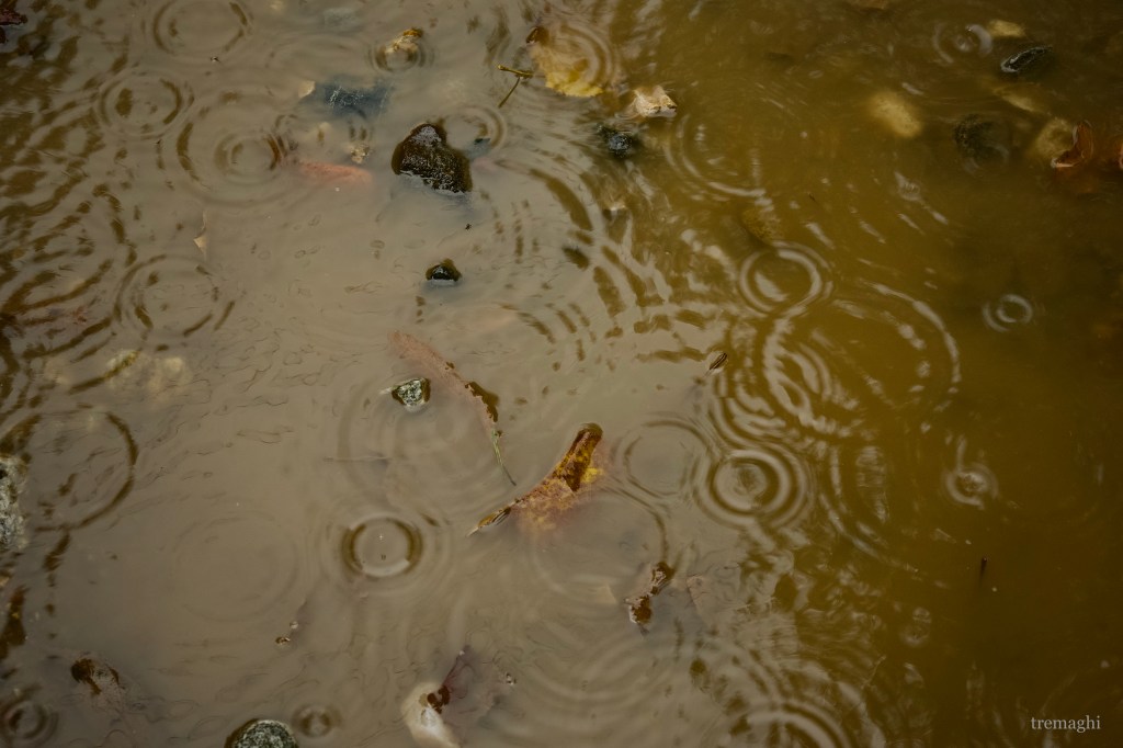 Poco distante dei girasoli selvatici catturano la mia attenzione, così pure le foglie a forma di cuore di arbusti ai lati dello sterrato. Mi cade lo sguardo a terra. Ricci di castagno rotti che spiccano sul terreno, formando un quadro naturale di natura morta e poco più in là una pozzanghera, un insieme di cerchi perfetti disegnati dalla pioggia sulla superficie dall’acqua che sta iniziando a cadere copiosa. Mi sembra di essere ritornata bambina. La tentazione di saltarci dentro è grande, ma non voglio rompere questo disegno in continua evoluzione.