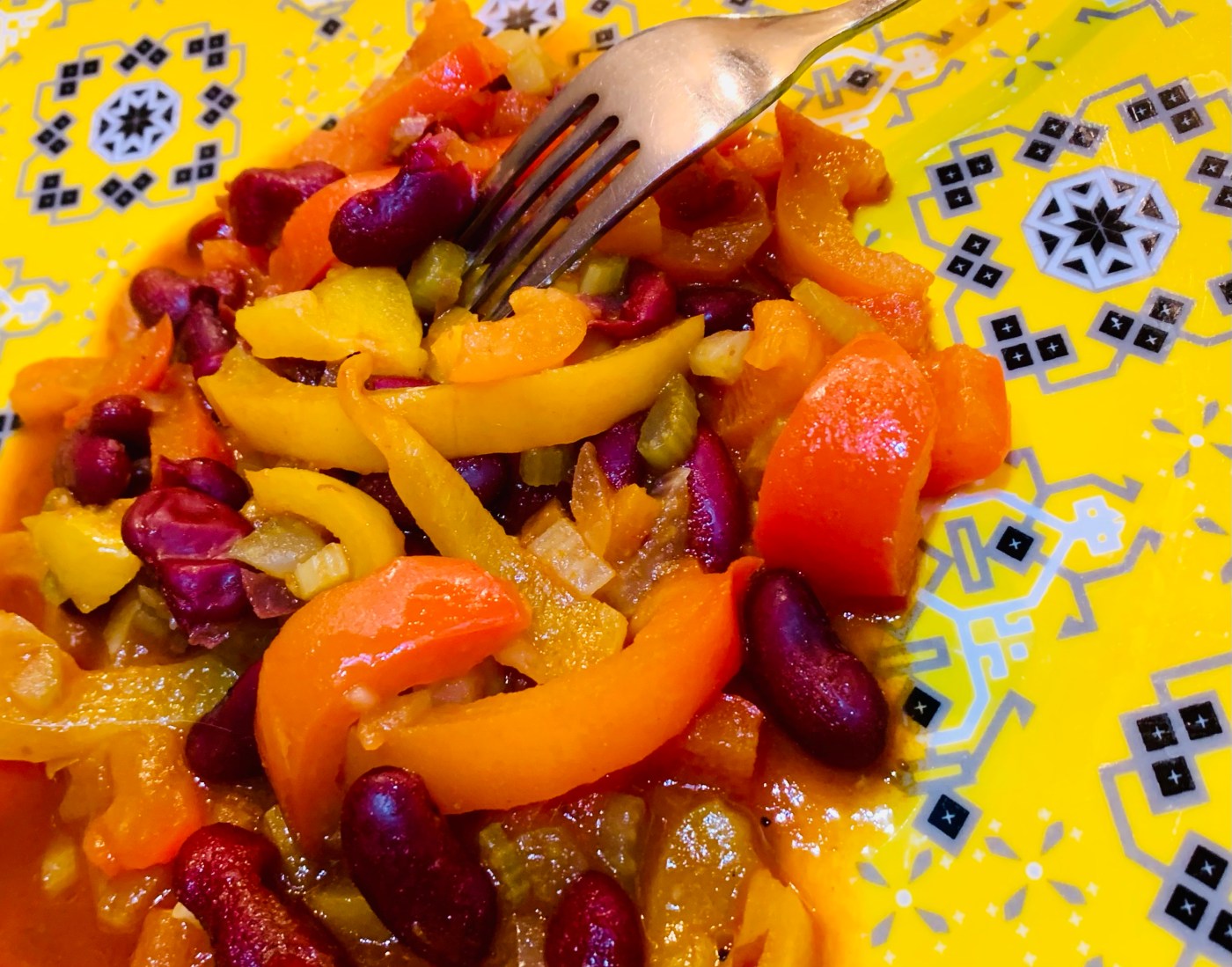La preparazione è semplicissima: tagliare a dadini piccolissimi una carota e un gambo di sedano, affettare una cipolla e tritare uno spicchio d’aglio con 2 piccoli peperoncini rossi, far appassire le verdure in poco olio extravergine d’oliva, quindi aggiungere 2 peperoni tagliati a listarelle (ne ho scelto uno arancione e uno giallo) e rosolarli un poco. Nel frattempo lavare molto bene sotto l’acqua corrente il contenuto di due scatole di fagioli rossi dal peso sgocciolato di 125 gr. cadauna, scolarli e aggiungere alle verdure e rimestare qualche minuto, coprire con acqua bollente e un cucchiaio di concentrato di pomodoro. Cuocere circa 20 minuti facendo addensare il liquido e una volta spento aggiungere un cucchiaino di curcuma in polvere e una generosa macinata di pepe nero. Tra gli ingredienti non figura il sale, non ne ho messo… il sapore deciso del peperoncino e le spezie non ne richiedono l’uso per il mio palato.
