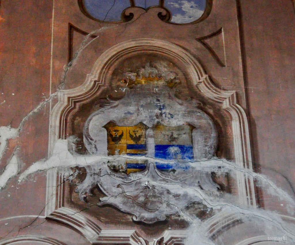 Di grande impatto è l’ampia scala con balaustra in marmo rosso che porta al piano superiore con i saloni in stile barocco e soffitti a cassettoni.