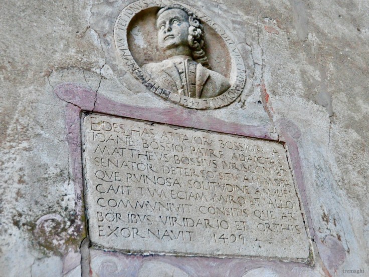 “Queste costruzioni degli antenati dei Bossi, da Giovanni Bossi padre accresciute, furono ampliate da Matteo Bossi giureconsulto e senatore su un luogo distrutto e abbandonato ed inoltre egli fortificò con un muro ed un fossato ed abbellì con alberi, parco ed orto nel 1495”.