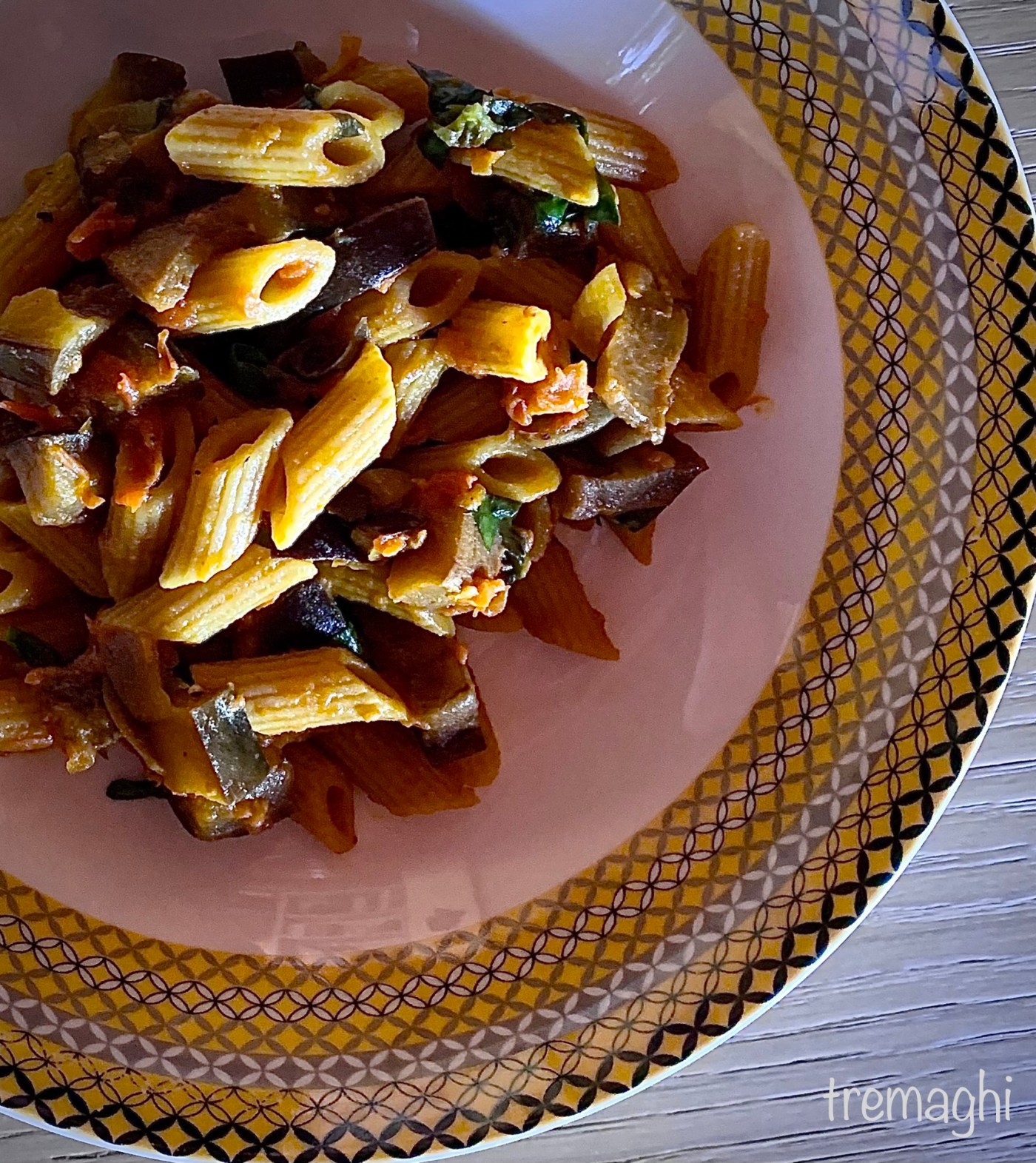 La curcuma, oltre a donare un colore ocra alla pasta e un pizzico di sapore orientale, è una spezia, che secondo alcune ricerche, è in grado di frenare le infiammazioni, agendo direttamente sulle cellule di fegato e pancreas, oltre a migliorare i valori della della glicemia, ad aumentare il colesterolo buono e in soggetti con aterosclerosi, a ridurre il rischio di trombi. La curcumina, che le conferisce il colore giallo è ritenuta la molecola della longevità, confermata dalla popolazione dell’isola giapponese di Okinawa che ne fa molto uso e dove si conta un numero molto alto di centenari in ottimo stato di salute sia fisica e mentale. La macinata di pepe nero (che aiuta a eliminare o moderare il consumo del sale) serve ad aumentare la biodisponibilità della molecola attiva della curcuma, amplificando le attività della curcumina e associato all’uso di olio extra vergine d’oliva, ne incrementa il suo assorbimento. Questo primo piatto si può considerare una vera miniera di componenti salutari grazie anche alle melanzane, la cui buccia contiene molecole della longevità e la polpa è una buona fonte di potassio e fibre, entrambi protettivi per il sistema cardiovascolare. Non da ultimo il pomodoro fresco, ricco di un carotenoide, il licopene, la cui biodisponibilità aumenta fino a cinque volte con la cottura. Studi scientifici presuppongono che i carotenoidi prevengano l’incrostazione delle arterie e il licopene sia un valido alleato nella prevenzione del tumore alla prostata. Che dire, tanta bontà in un concentrato di ingredienti salutari!