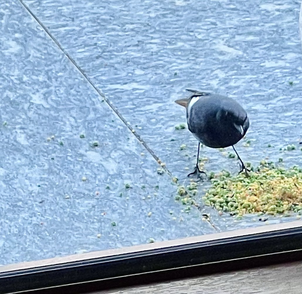 Da un pò di tempo abbiamo visto posarsi sulla ringhiera un simpatico uccellino dal piumaggio molto scuro e piume rosso-arancione in prossimità della coda, vi rimane finché uno dei nostri gatti non si avvicina ai vetri incuriosito o viene disturbato da qualche movimento all’interno di casa. Osservando attentamente in lontananza quando arriva più volte al giorno, con grande soddisfazione l’abbiamo visto beccare il mangime sul pavimento.