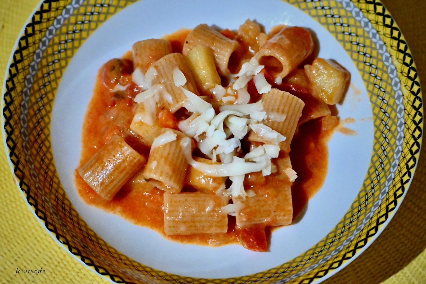 A questo punto butto la pasta, le patate scolate e faccio cuocere per circa 3 minuti sempre rimestando delicatamente e facendo attenzione che tutti gli ingredienti si amalgamano con il sugo in modo uniforme.