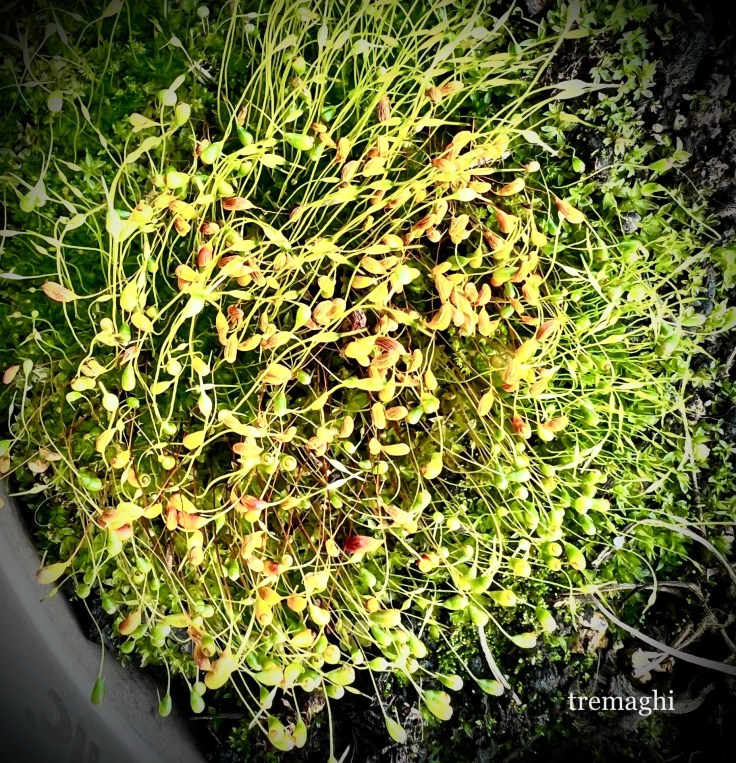 Mi soffermo nel silenzio mattutino ad ammirare i fiorellini dai petali a forma di cuore, le giovani foglie rugose con i boccioli che vi fanno capolino e poco più in là una moltitudine di sottili peduncoli sopra il letto di morbido muschio con all’estremità una sorta di piccolo sacchettino, forse pieno di spore che verranno rilasciate in seguito.
