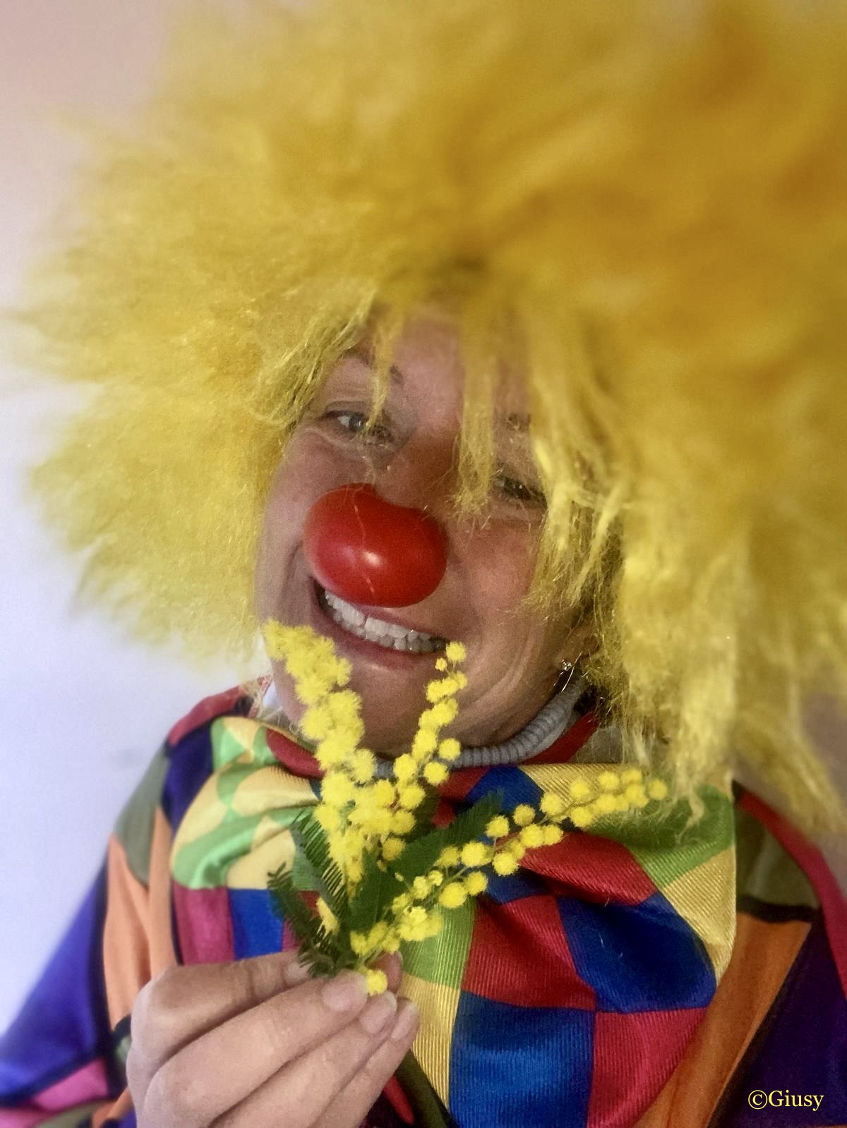 Quanto è bella questa foto di Giusy in maschera che con il suo immancabile dolce sorriso porge una mimosa, un gesto simbolico che voglio far mio, donare un fiore e serenità a tutte le Donne del mondo.