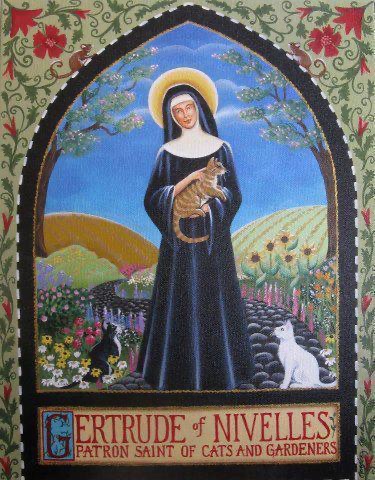 Tra le tante immagini di Santa Gertrude trovate nel web, ho scelto quella che la ritrae in un bellissimo giardino fiorito e circondata da gatti, un’icona dal sapore primaverile che infonde tanta dolcezza a chi ama incondizionatamente questi adorabili felini.