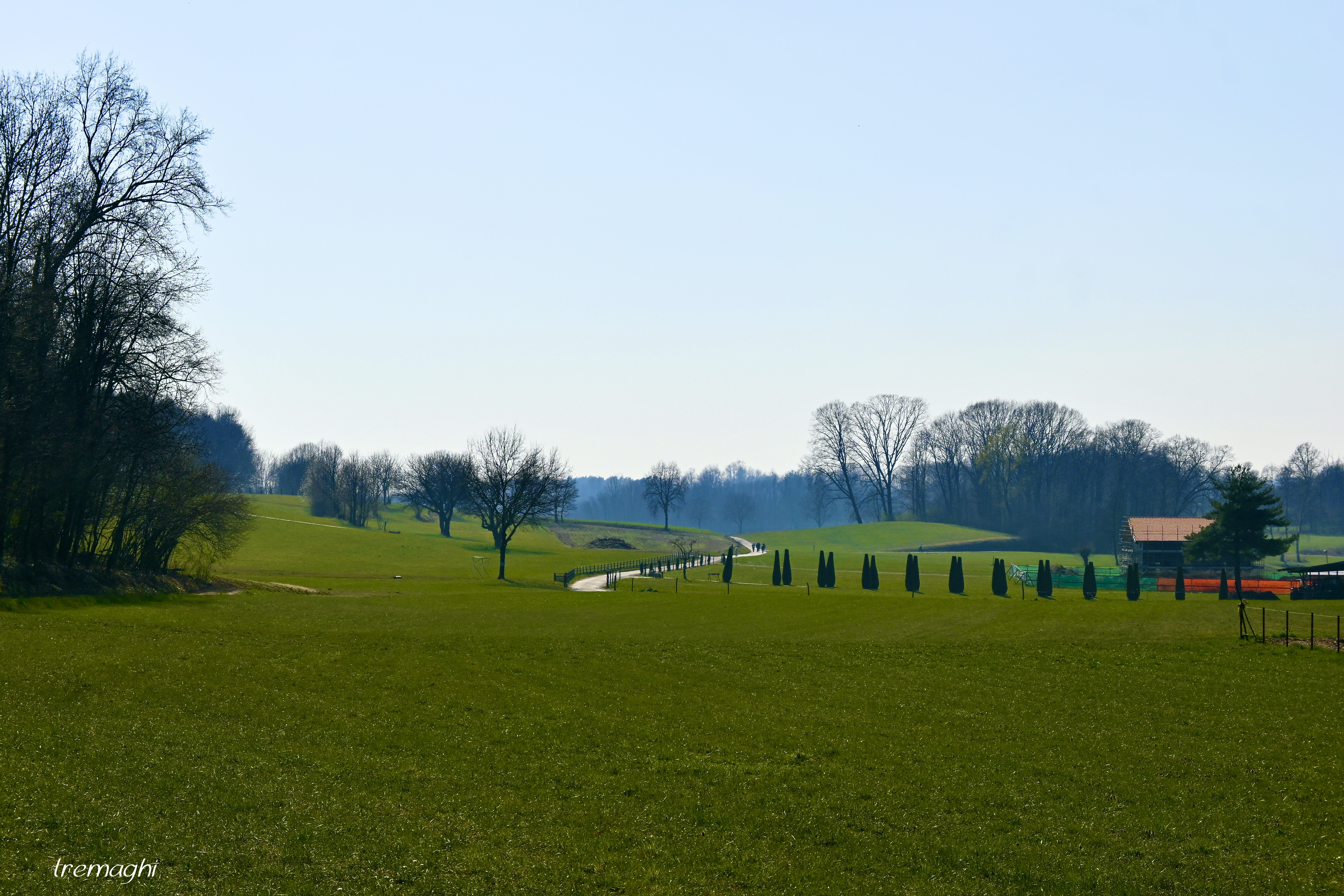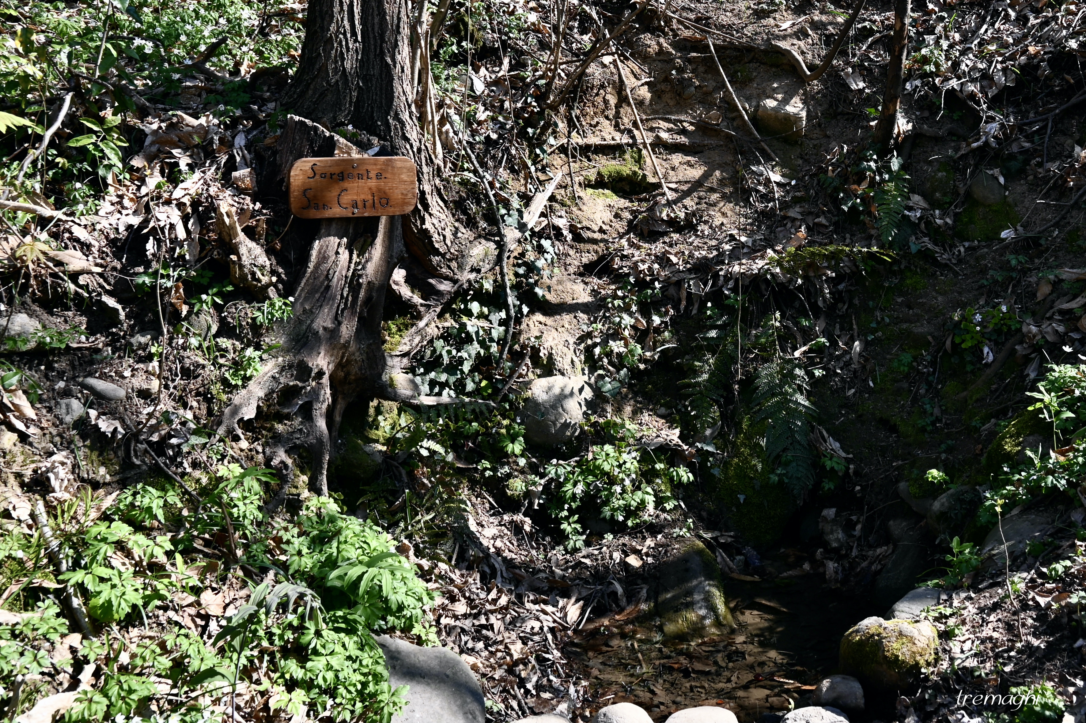 Percorriamo i sentieri boschivi attorno ad Azzate, una piccola incisione su legno indica la Sorgente San Carlo, poi scendiamo verso la piana di Vegonno che da lontano ha un aspetto davvero fiabesco.