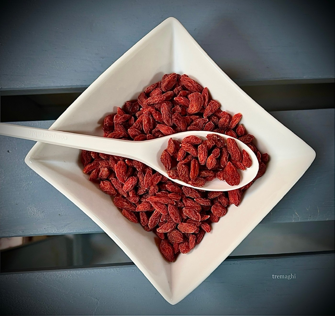 Sono le bacche di goji, frutto del Lycium (barbarum o chinense), nome che deriva dalla Licia (Λυκία), una regione dell’Anatolia meridionale, sebbene siano originarie degli altipiani asiatici di Cina, Tibet e Mongolia e crescano spontaneamente anche nelle valli himalayane. Anche nella medicina cinese queste bacche sono conosciute come Frutto di Licia, alle quali vengono attribuite numerose proprietà curative e preventive soprattutto la sua eccezionale capacità di nutrire il sangue e lo yin, efficacie già descritte nel Classico sulle radici di erbe del Contadino divino (Shennong Ben Cao Jing), la più antica attestazione scritta sulla scienza erboristica cinese risalente al I o II secolo dopo Cristo.