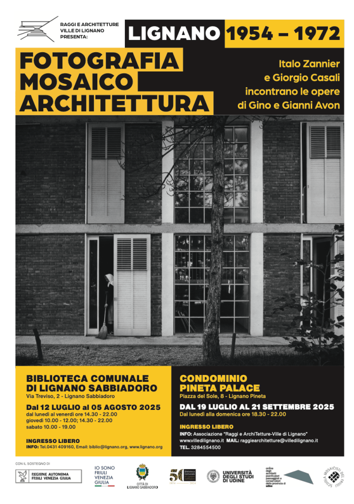 La seconda mostra “Lignano 1954-1972. Fotografia Mosaico Architettura” si tiene presso il Pineta Palace a Lignano Pineta in Piazza del Sole 8, il condominio progettato da Gianni Avon alla fine degli anni ’50 ed impreziosito dai mosaici del padre Gino. Oltre alle fotografie di Giorgio Casali delle opere di Gianni Avon che hanno cambiato il volto estetico di Lignano negli anni di maggior espansione turistica e che fanno parte dell’archivio dello Studio Associato Avon, sono presenti mosaici della Scuola Mosaicisti del Friuli ed è visitabile tutti i giorni fino al 21 settembre dalle 18:30 alle 22:00.