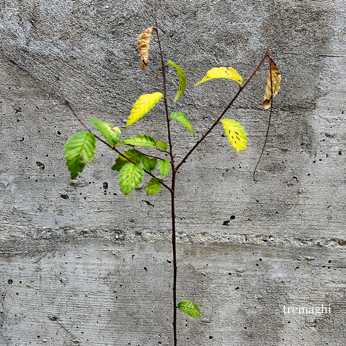 Quanto è bella la piantina di Olmo che questa primavera è sbocciata tra gli autobloccanti davanti al nostro garage. Così piccina, che per germogliare ha cercato e trovato una breccia con tenacia tra stretti pazzi di cemento, ha un fascino particolare nella sua caducità autunnale, mi trasmette la consapevolezza dell’effimero, ricordandomi che rapidamente tutto cambia, in questo caso seguendo i ritmi della natura.